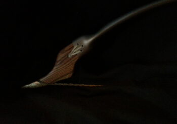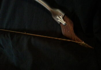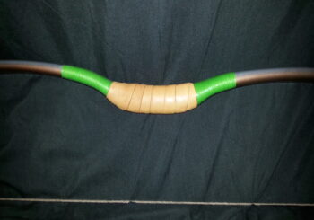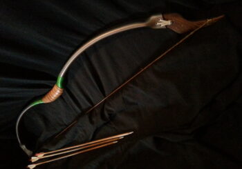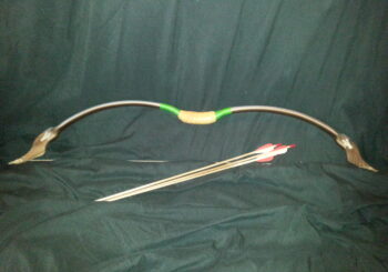 Fantasy bow made from PVC pipe. 45 lb draw. gold leafed tips on oak syhas (pronounced sigh-uh). Deer skin grip and double loop handmade hemp flemmish twist bow string. Made by Steve Greeno.